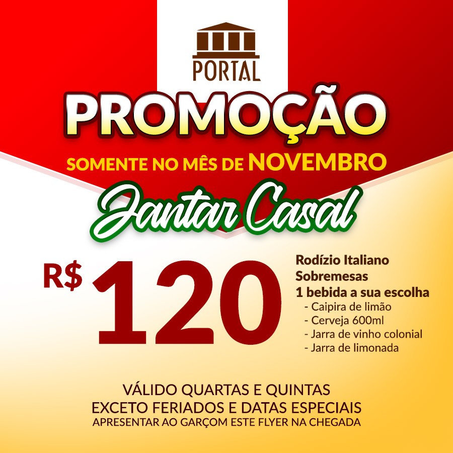 - 1 bebida de sua escolha (1 caipira de limão ou 1 cerveja 600ml ou 1 jarra de vinho colonial ou 1 jarra de limonada)
